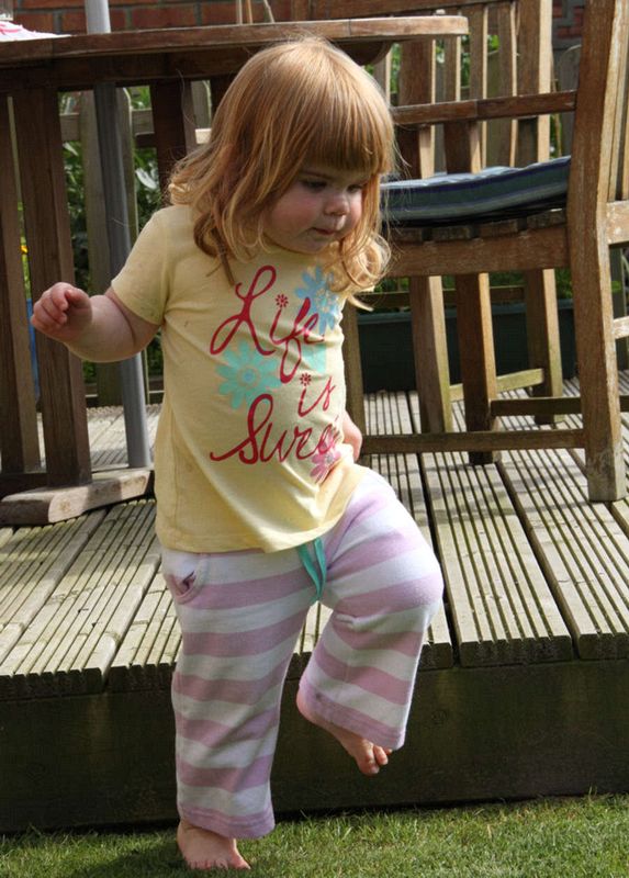 In the previous week, Roy and Maisie (mostly Maisie, very much in charge) worked out a routine whereby they stood on the edge of the decking, Roy said: Ready, Steady, Go! and they both jumped down. Then Maisie ran round in a half-circle and climbed back onto the decking, and they started all over again. On this day, they both stood on the edge of the decking, Roy said: Ready, Steady, Go! and jumped down, all by himself. Maisie stood serenely on the decking, and in her own time sedately stepped down (and ran round in a half-circle and climbed back onto the decking). Here she is, doing just that. | |